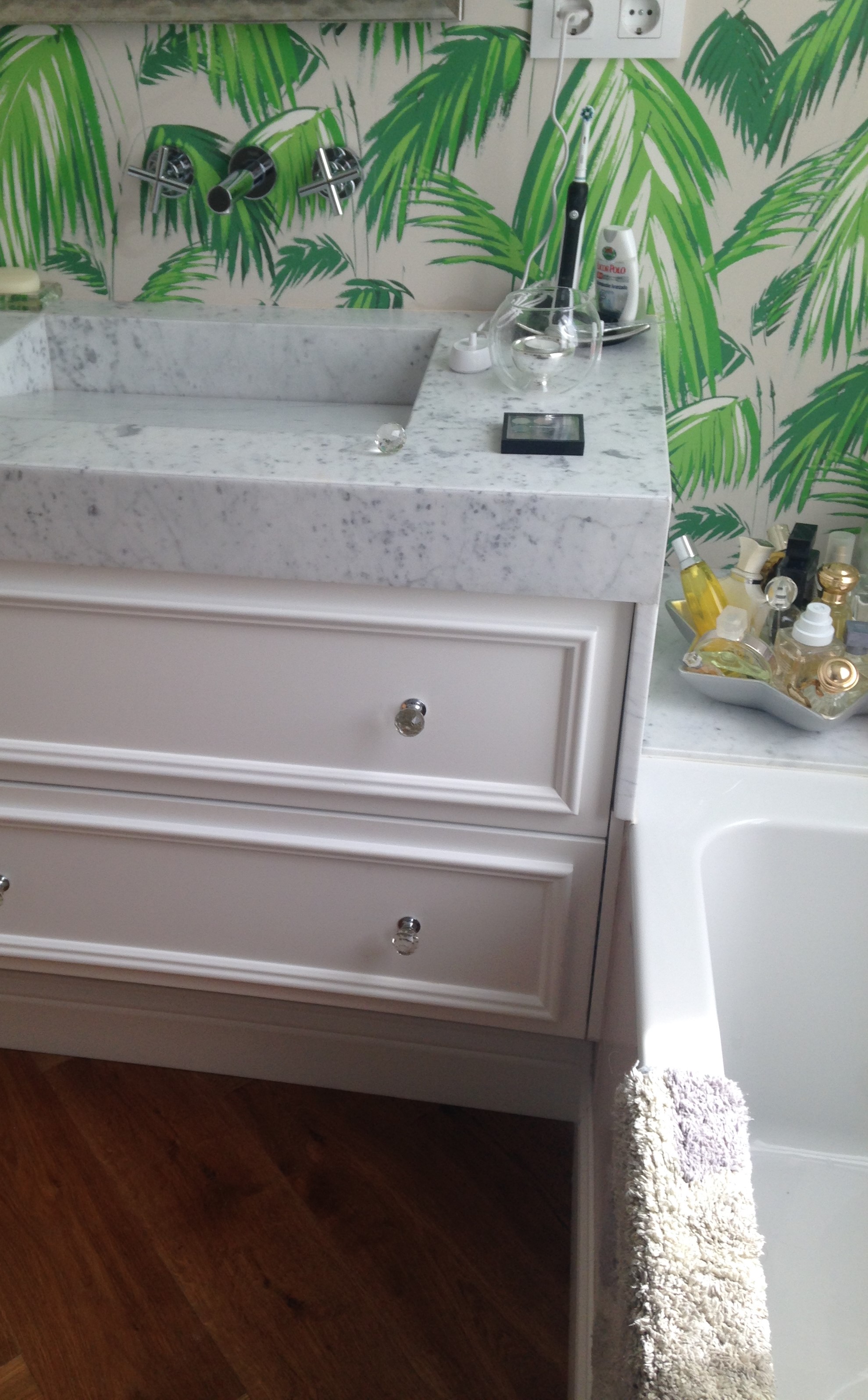 A continuación, el vestidor a medida, con puertas lacadas con molduras, tocador y pomos modernistas, esconde además, la puerta del baño privado de esta habitación. El baño privado, con un toque fresco con papel de palmeras y microcemento rosado, es equipado con un mueble a medida con sobre y lavabos integrados de mármol y bañera de hidromasaje, con unas bonitas vistas a la montaña. En las dos cabinas, con puertas de cristal, encontramos la ducha también hecha a medida con tiras de mármol y el wc.