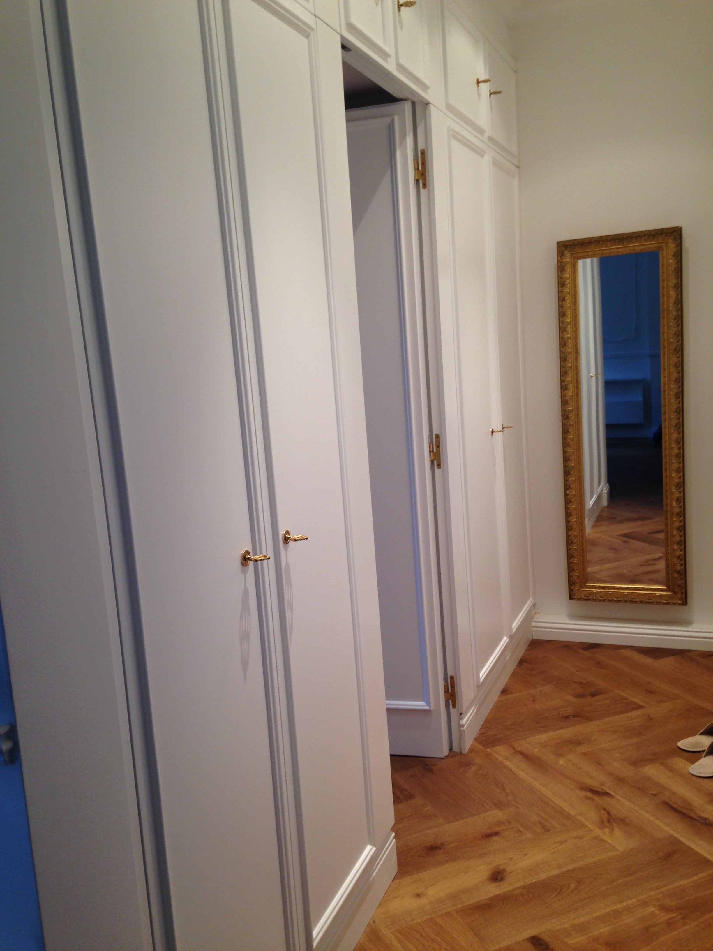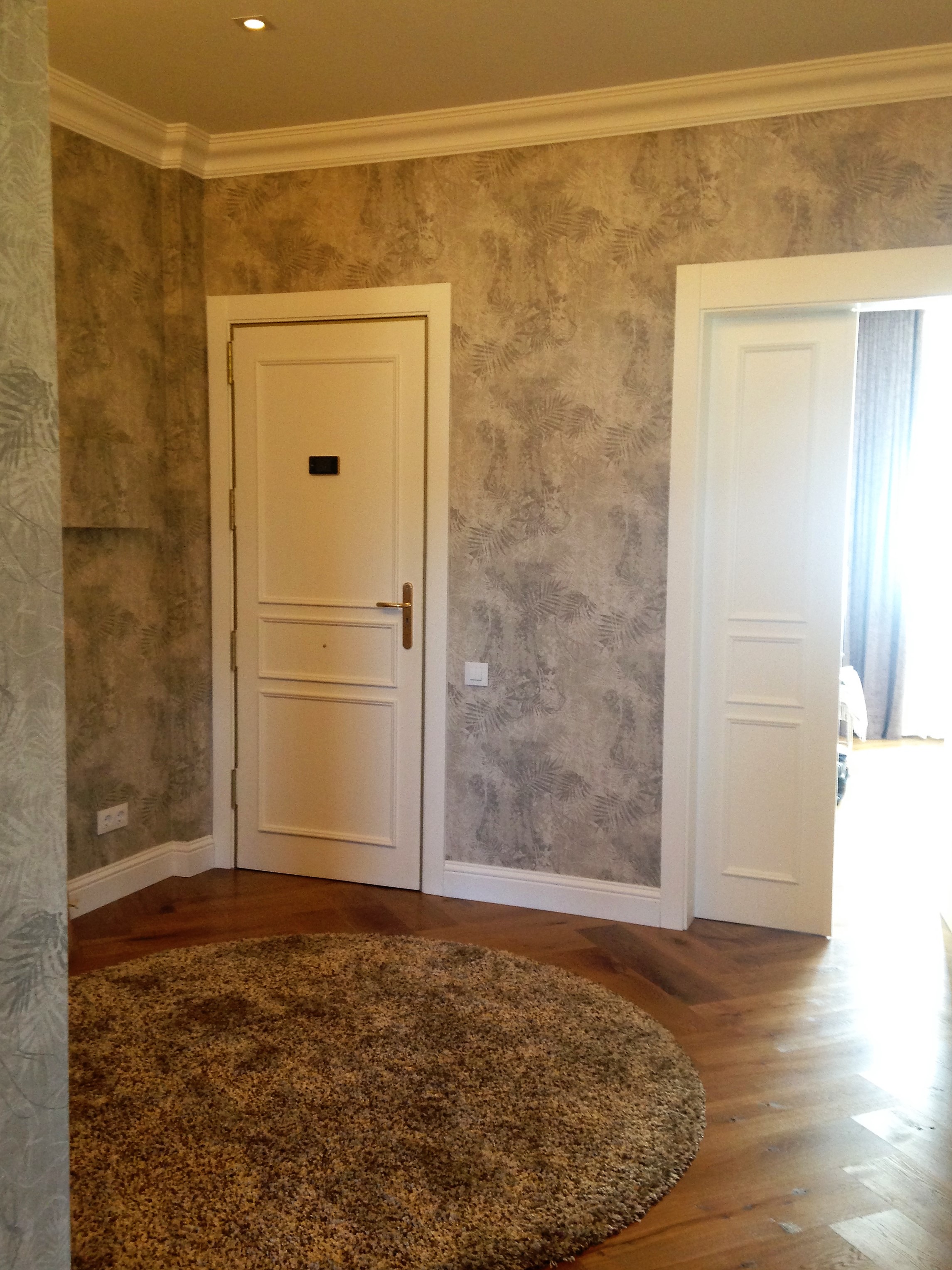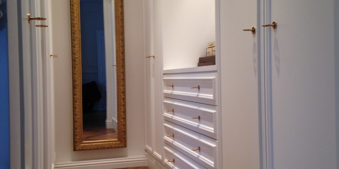 El recibidor, con mueble integrado de almacenaje y vestido con papel pintado, da acceso a todas las estancias con puertas a medida, lacadas y molduradas con pomos dorados. El baño de cortesía, es una pieza clave de la casa, con un estilo clásico y elegante para sus invitados.