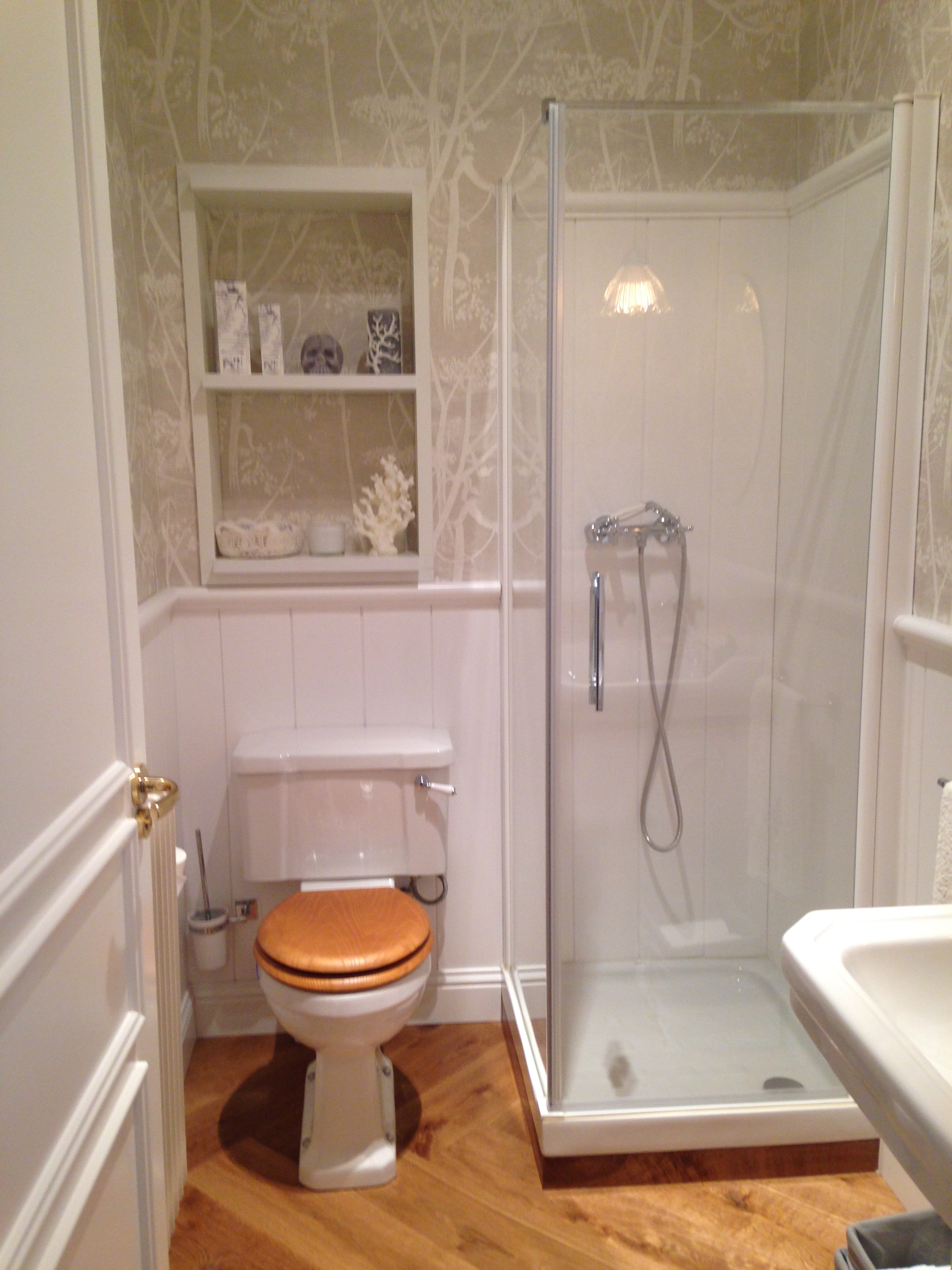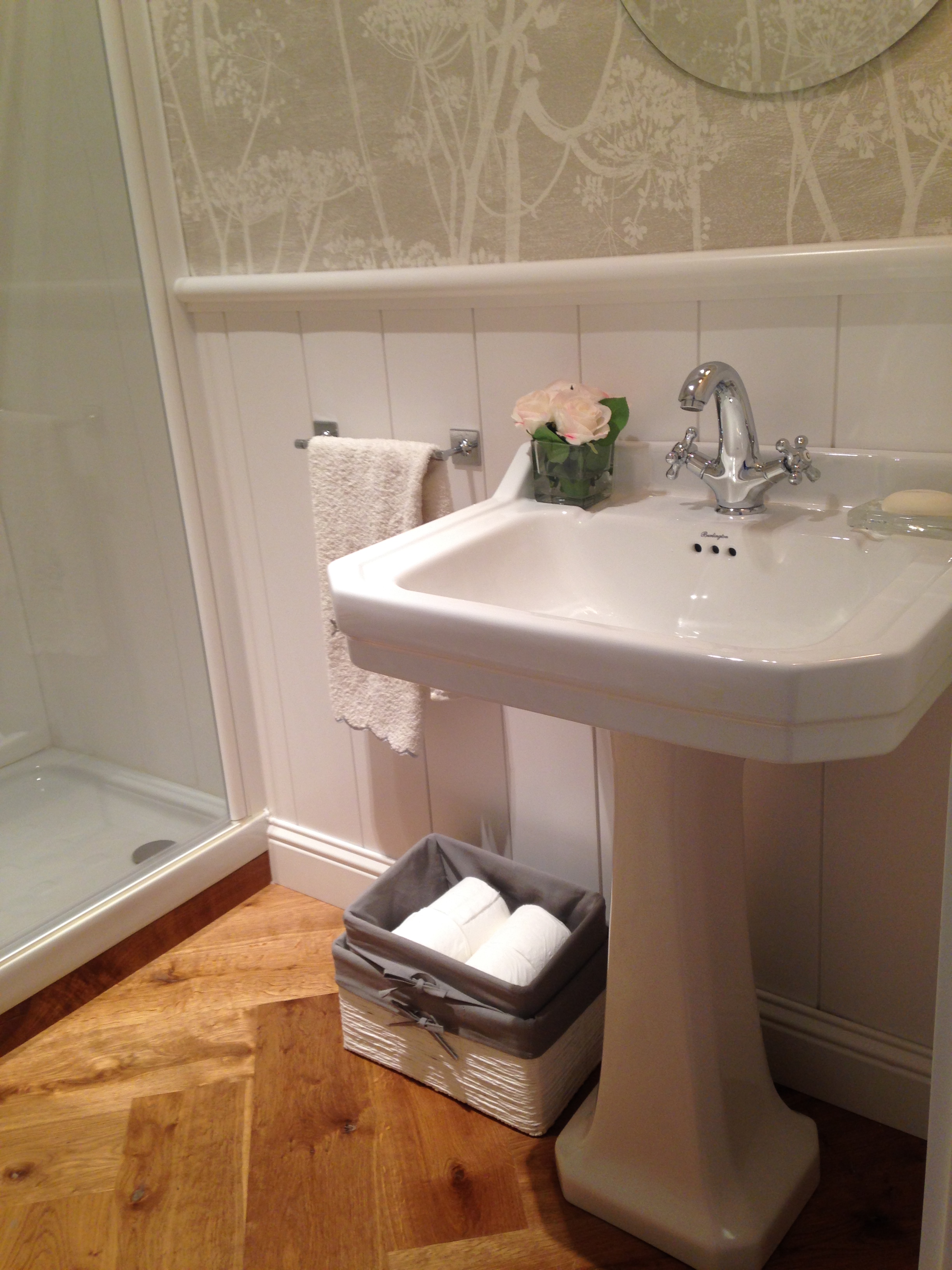 El rebedor, amb moble integrat d’emmagatzematge i vestit amb paper pintat, dóna accés a totes les estances amb portes a mida, lacades i motllurades amb poms daurats. El bany de cortesia, és una peça clau de la casa, amb un estil clàssic i elegant per als seus convidats.