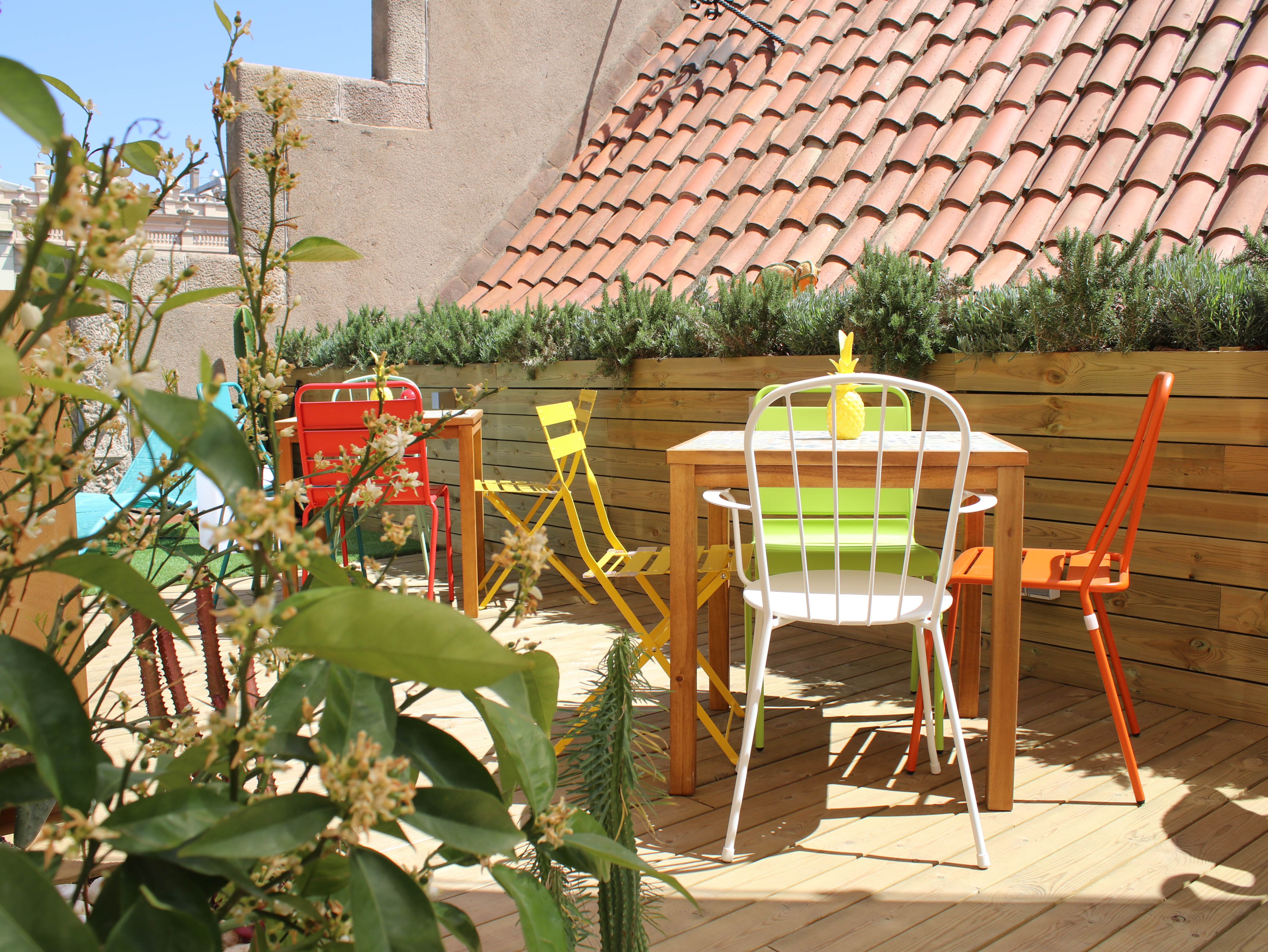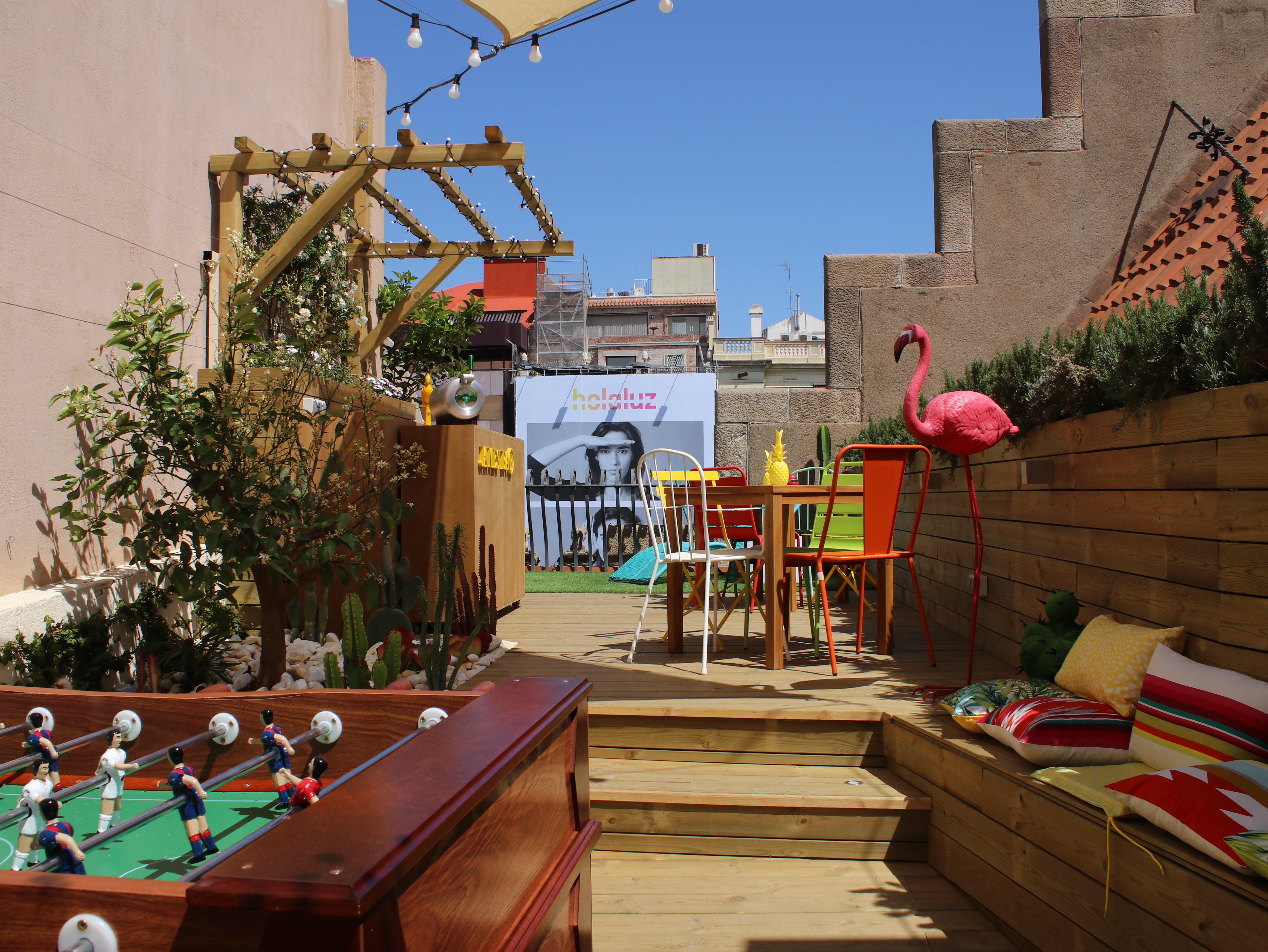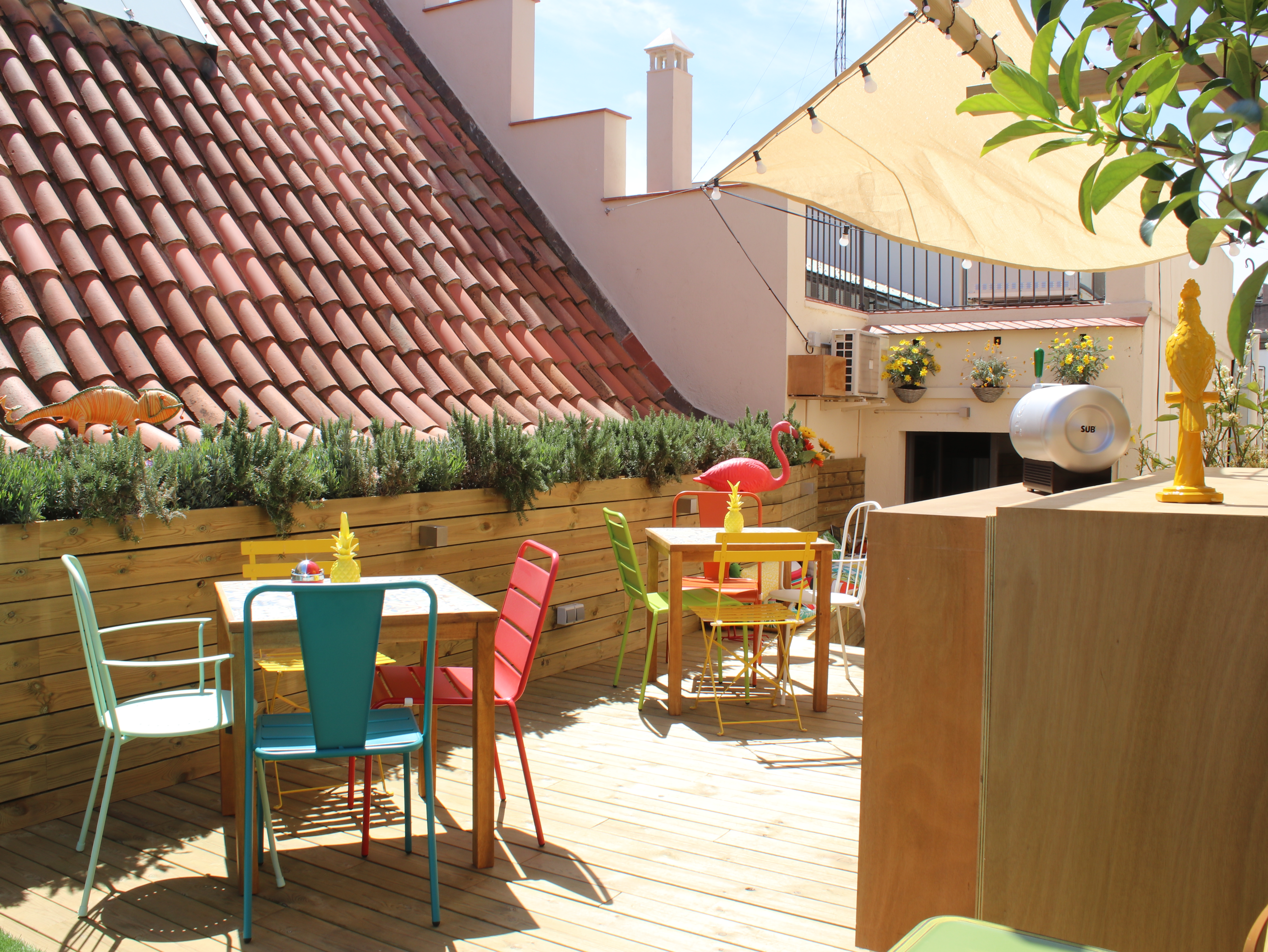 A la terrassa, es va dissenyar un espai alegre i desenfadat amb diferents zones de descans i activitats, molta vegetació i una barra de bar. Es planteja com una àrea on poder desconnectar, fer esdeveniments, reunions desenfadas i escoltar a James Brown, una altra icona de la marca.