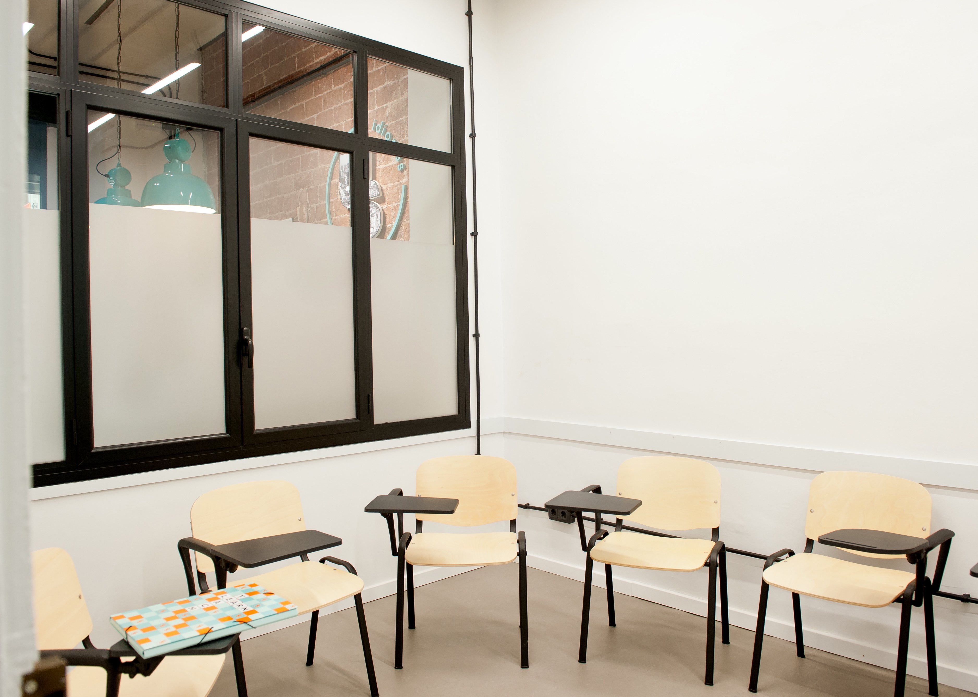 En aquest nou espai es va crear una recepció àmplia i ben visible des del carrer a travès d’un gran finestral amb rètol retroiluminat, una zona d’espera, una aula gran i un aula petita per a classes particulars i un bany adaptat i un bany privat per als professors.