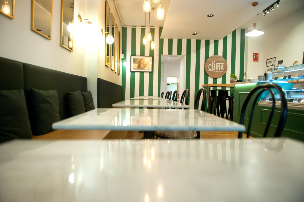 Els llibres de cuina i rebosteria decoren les parets lligant l’espai amb la famosa llibreria +Bernat a uns metres de distància, on també serveixen des de la gran cuina, totalment equipada, que trobem al final del local.