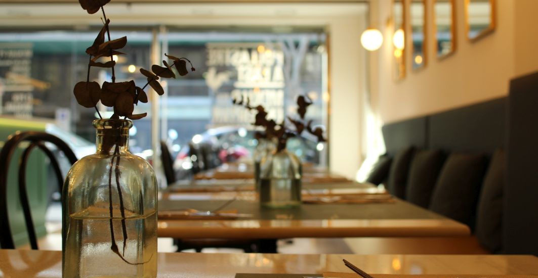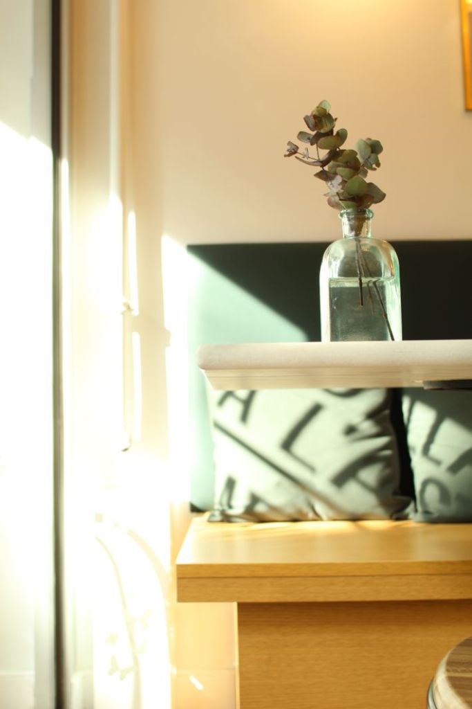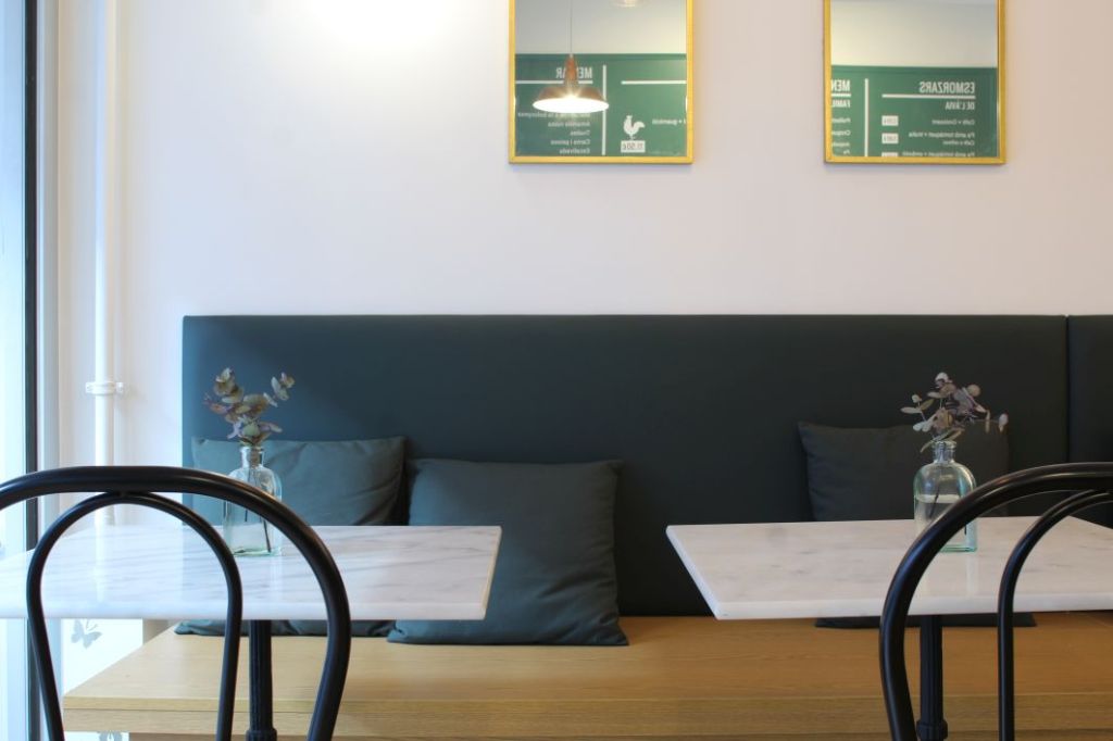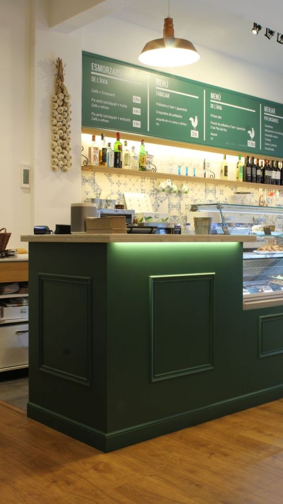 La fusta, el verd, el gris, el marbre i els complements daurats completen el conjunt per a que et sentis com a casa. Una llarga barra de taulell de marbre i panells de fusta pintats de verd, exposen el producte fresc i creen un recorregut ordenat per a fer una comanda ágil i ràpida.