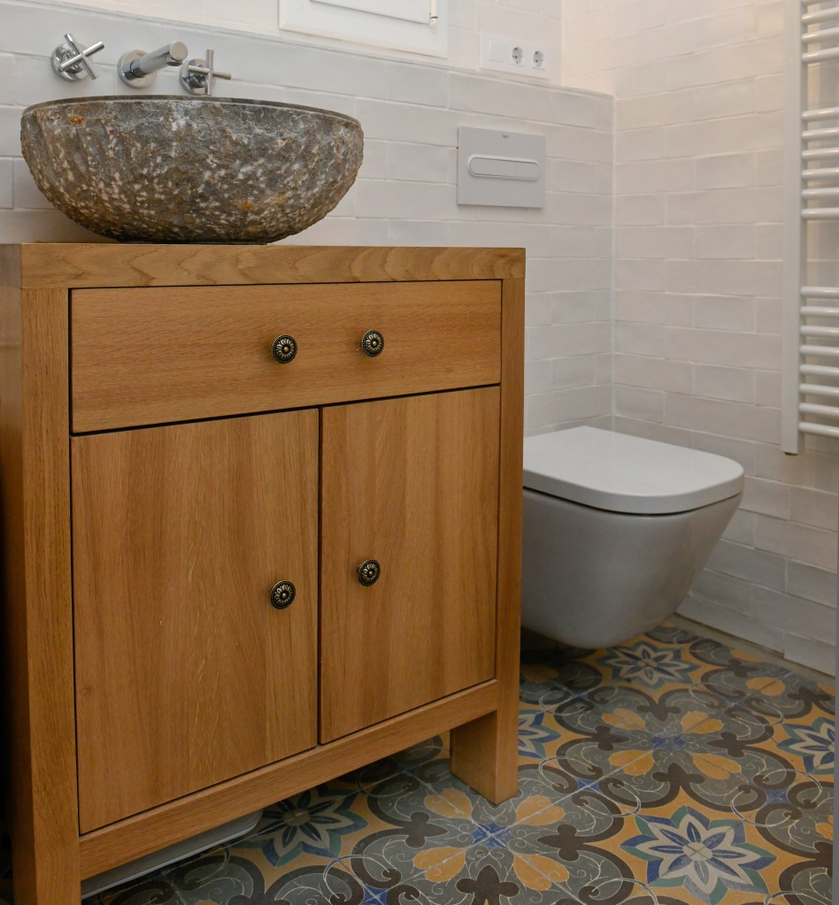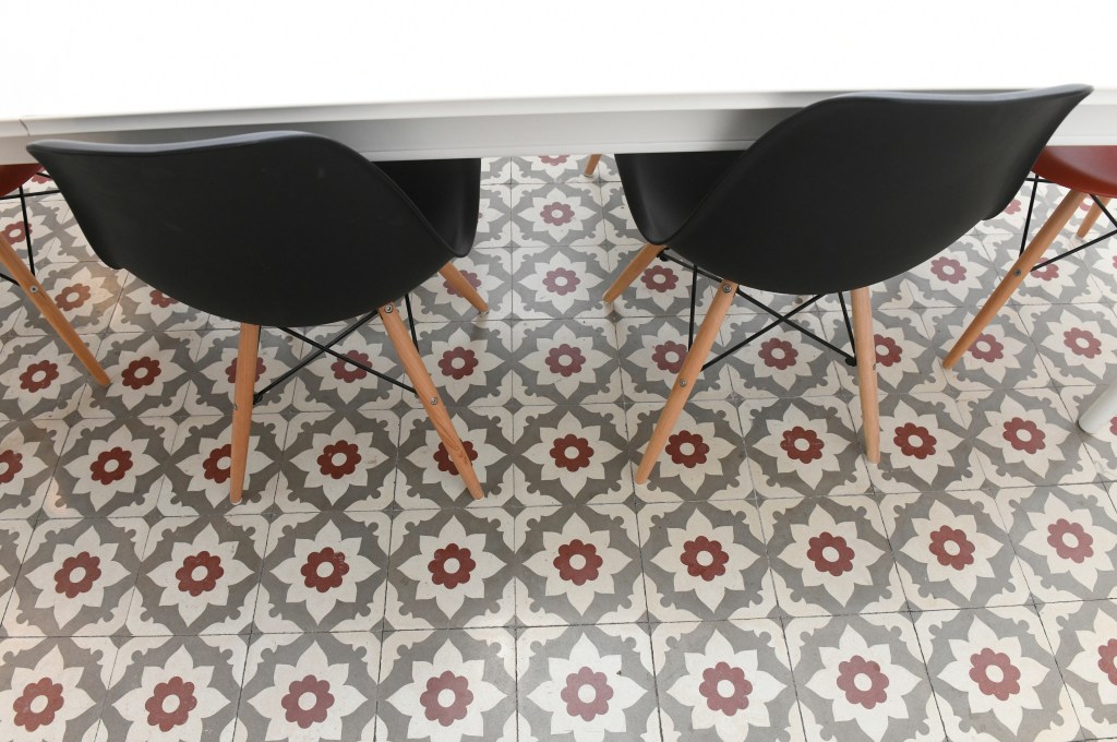 Un hecho curioso de este proyecto, fue cuando levantamos un pavimento horroroso de los años 60, con el fin de nivelar toda la vivienda, que presentaba muchas deformaciones, para poner parquet. Al levantar el embaldosado, nos encontramos con el pavimento hidráulico original, del cual, la clienta, se enamoró completamente. Estaba tan dañado en muchos puntos que era imposible conservar en su totalidad y lo necesitaba levantar con la finalidad de nivelarlo, lo que dañó muchas más piezas. Finalmente, jugando con las piezas que teníamos y resituando-según la nueva distribución, conseguimos que todas las estancias tuvieran pavimento hidráulico, salvo del pasillo donde se colocó pavimento de madera natural como se tenía previsto.
