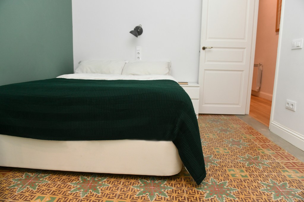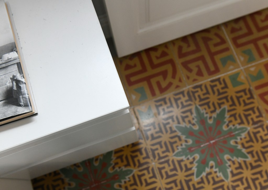 Un fet curiós d’aquest projecte, va ser quan vàrem aixecar un paviment horrorós dels anys 60, per tal d’anivellar tot l’habitatge, que presentava moltes deformacions, per tal de posar parquet. Al aixecar el enrajolat, ens vàrem trobar amb el paviment hidràulic original, del qual, la clienta, es va enamorar completament. Estava tan malmès en molts punts que era impossible de conservar en la seva totalitat i el necessitava aixecar per tal d’anivellar, fet que va malmetre moltes més peces. Finalment, jugant amb les peces que teníem i ressituant-les segons la nova distribució, vàrem aconseguir que totes les estances tinguessin paviment hidràulic llevat del passadís on es va col·locar paviment de fusta natural com es tenia previst.