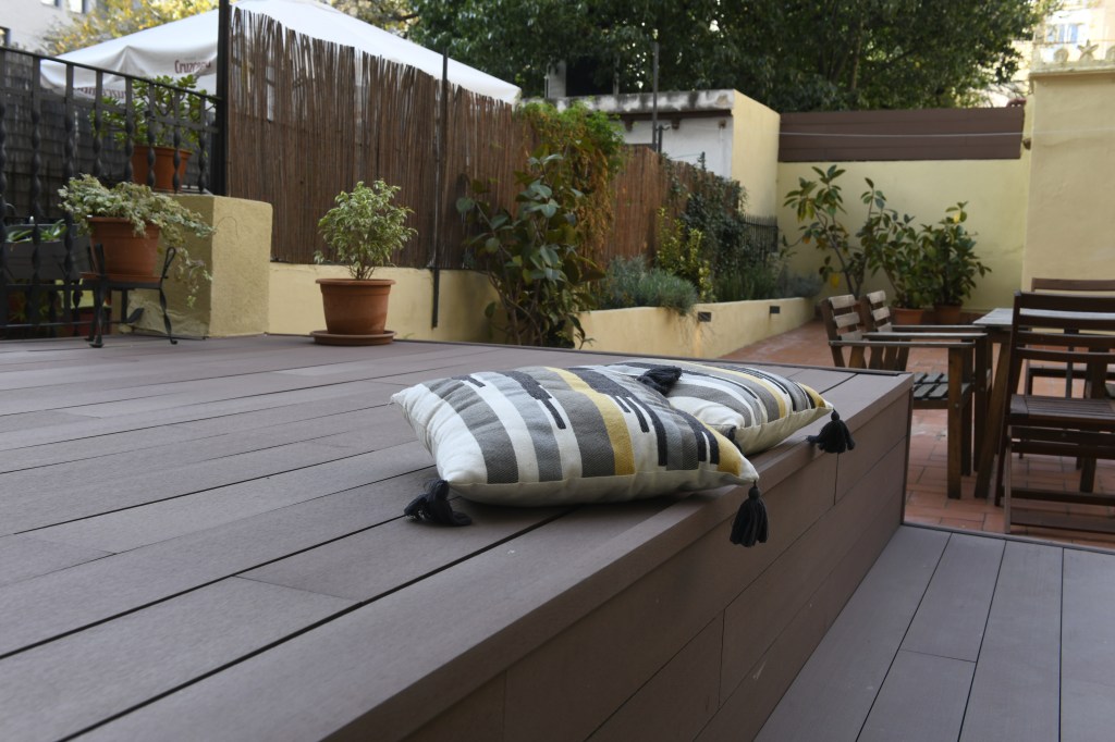 Per últim, a la terrassa es va formar una plataforma amb tarima sintètica d’exterior per tal de crear un espai on prendre el sol, recuperant aquesta superfície que es trobava inclinada i no es podia utilitzar. També es van formar jardineres corregudes per tal de plantar especies trepadores i aïllar la terrassa de les vistes dels veïns.