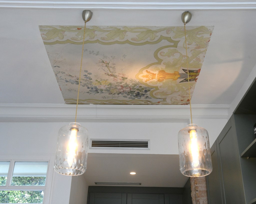Y esta no fue la única sorpresa! Al sacar el cielo raso de la cocina encontramos un fresco que hicimos iluminar de forma directa desde los muebles altos de la cocina.