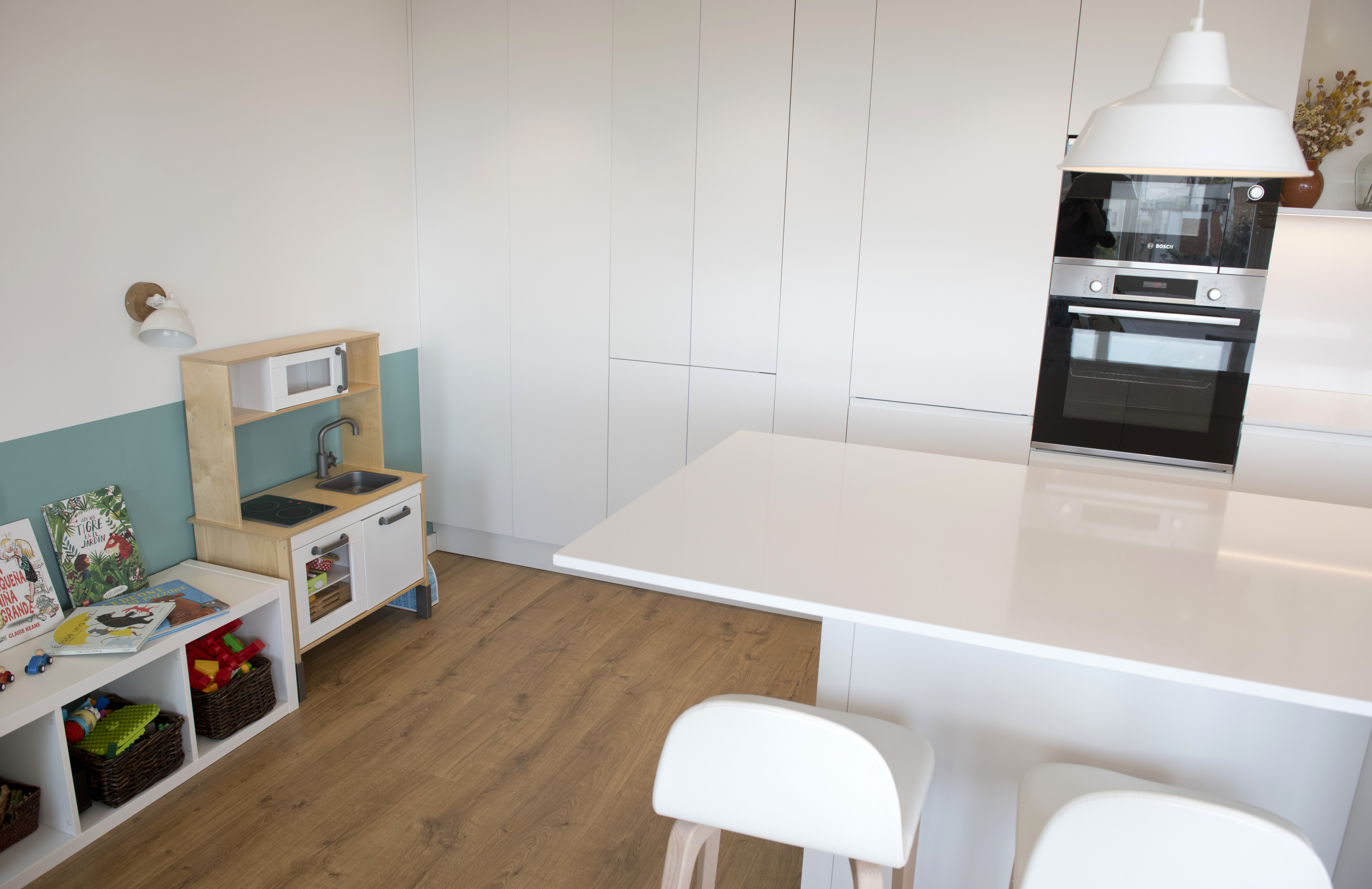 Una vez obtenido el permiso de la comunidad de vecinos, se crearon tres grandes apeos y se redistribuyó la vivienda para conseguir tres habitaciones (una gran suite con vestidor y baño privado, una habitación para los niños y un despacho que en un futuro se pudiera convertir en una segunda habitación), un segundo baño, un recibidor, un trastero, un lavadero y un balcón. El resto del espacio se convertía en una gran zona común con salón comedor, cocina abierta y zona de juegos infantil conectada con la cocina. Este espacio, amplio y luminoso, iba a ser el centro del hogar.
