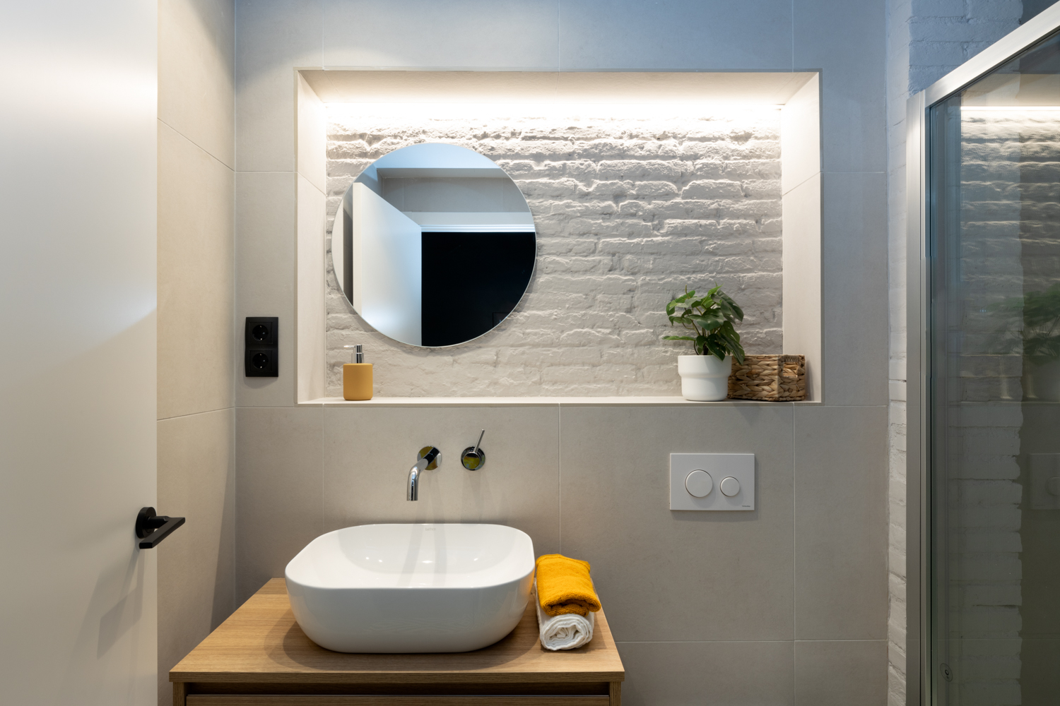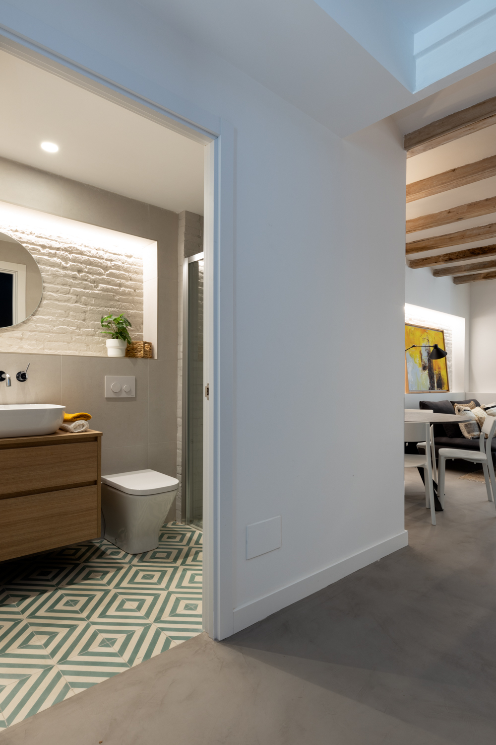 Este loft duplex, cuenta con acceso directo desde calle y patio posterior. El recibidor da acceso a la zona de salón comedor cocina con tres escalones y una escalera de chapa plegada con barandilla formada de listones de madera y pasamanos de hierro con led integrado. La cocina se encuentra integrada bajo esta escalera aprovechando cada centímetro cuadrado. Tres baños completos y tres habitaciones dobles completan el conjunto.