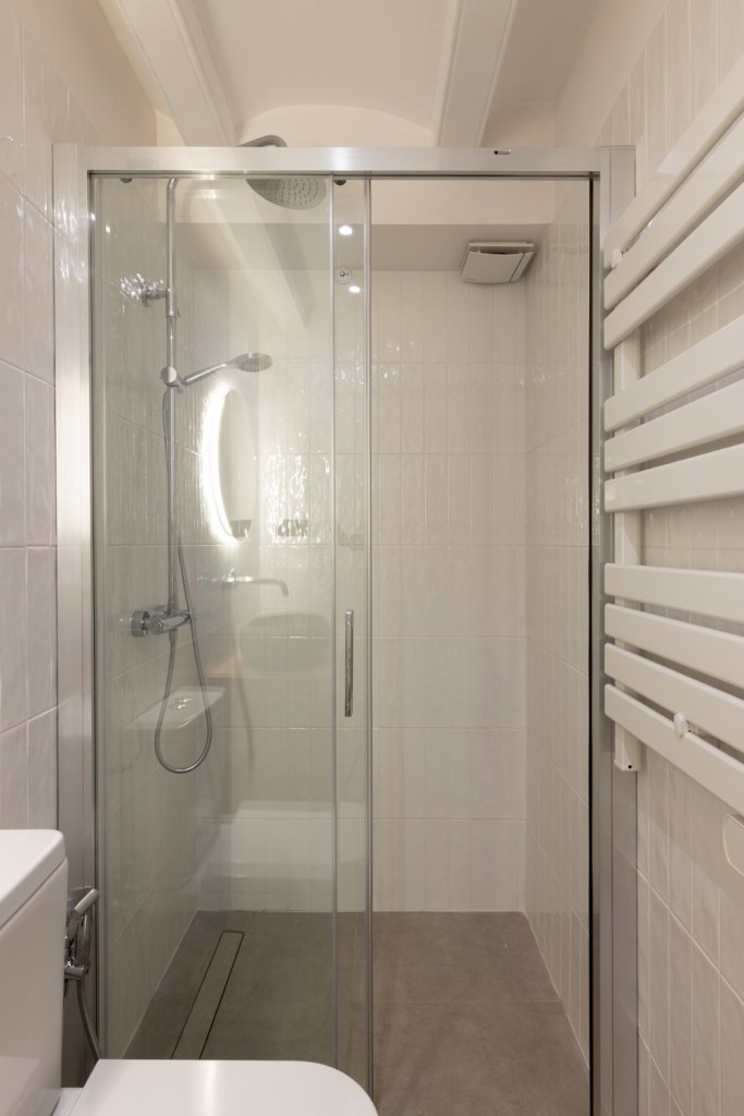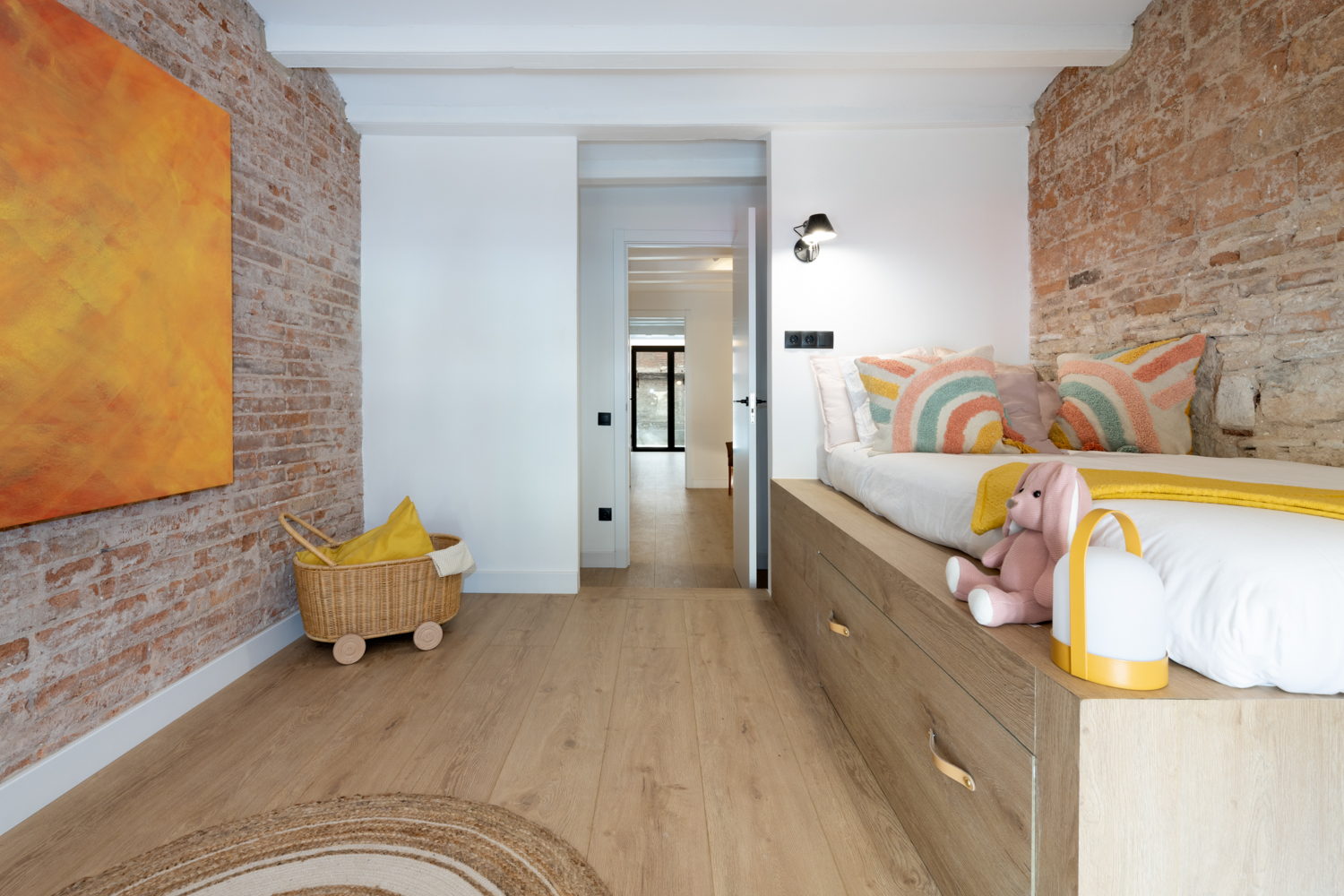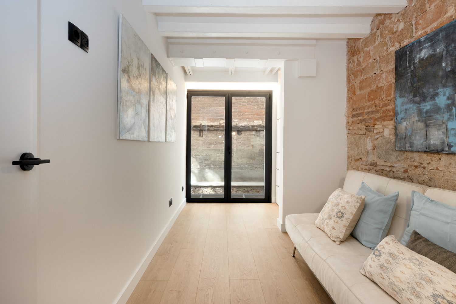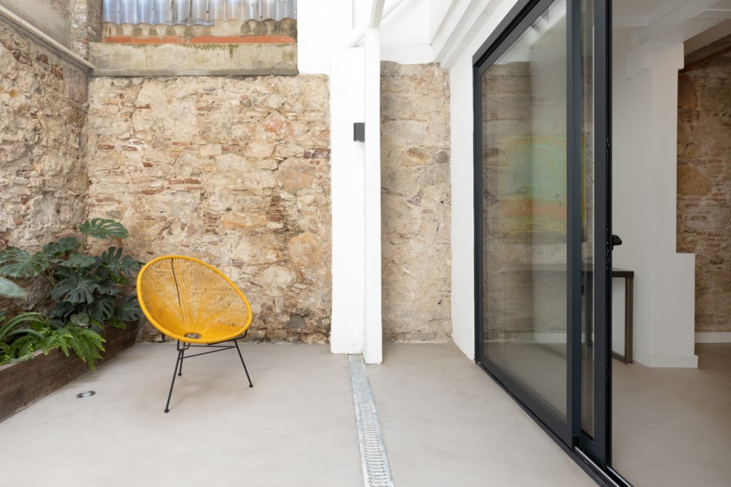 Aquest loft duplex compta amb accés directe des de carrer i pati posterior. El rebedor dóna accés a la zona de sala d’estar menjador cuina amb tres esglaons i una escala de xapa plegada amb barana formada de llistons de fusta i passamans de ferro amb led integrat. La cuina, a mida, està integrada sota aquesta escala aprofitant cada centímetre quadrat. Tres banys complets i tres habitacions dobles completen el conjunt.