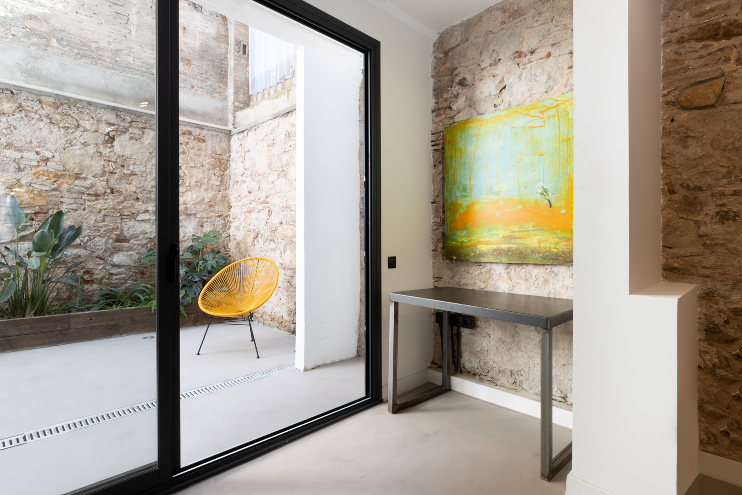 Es creen les màximes obertures amb vistes al pati, que es potencia amb un jardí tropical, a través de l’estintolament de façana posterior ja que originalment comptava amb dues petites obertures, com és típic en aquest tipus de construccions del Poblenou. Projecte en col.laboració amb l’Arquitecte Mar Hortal.