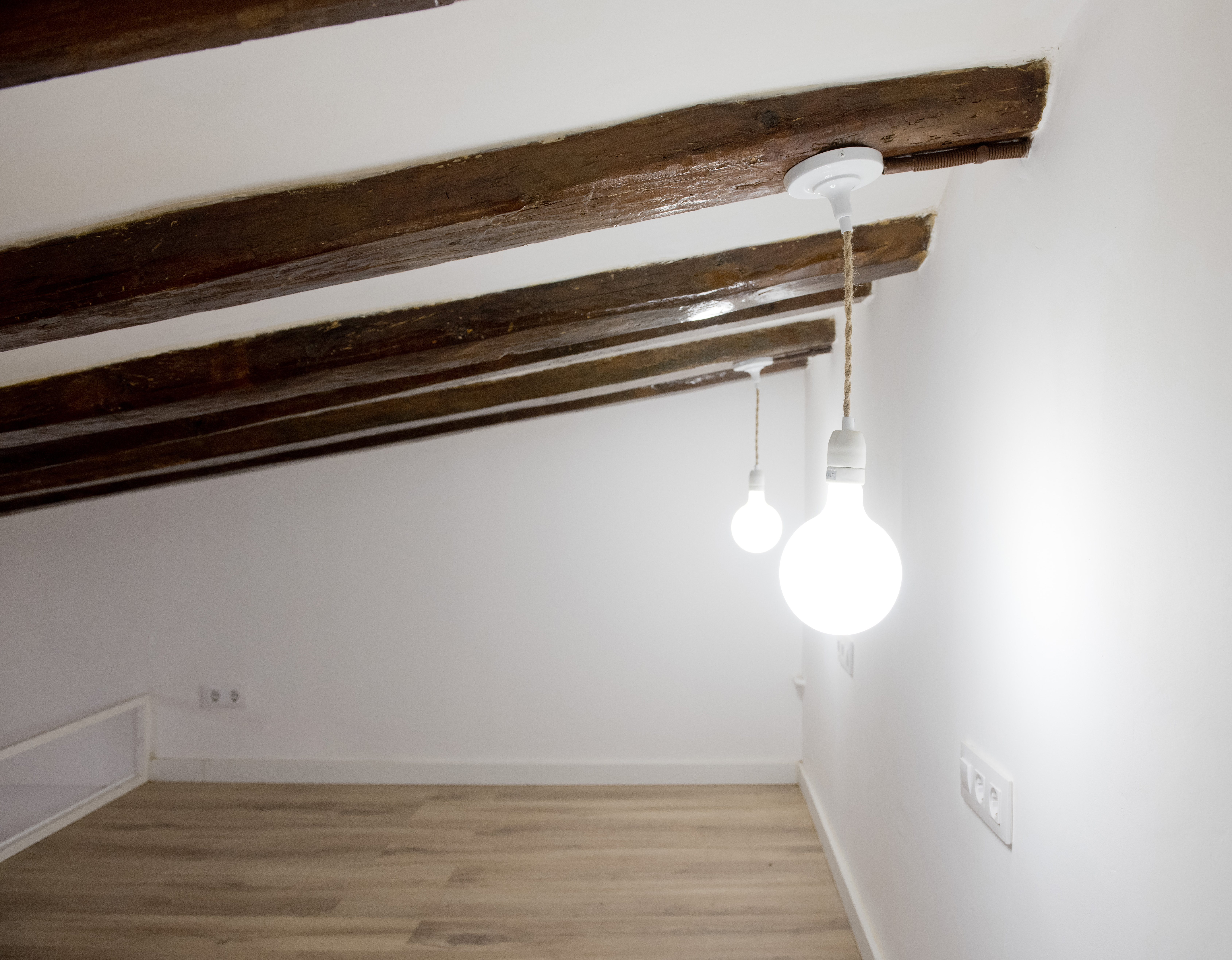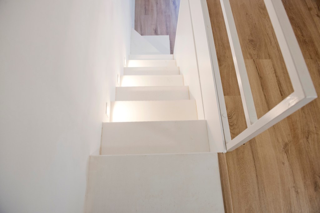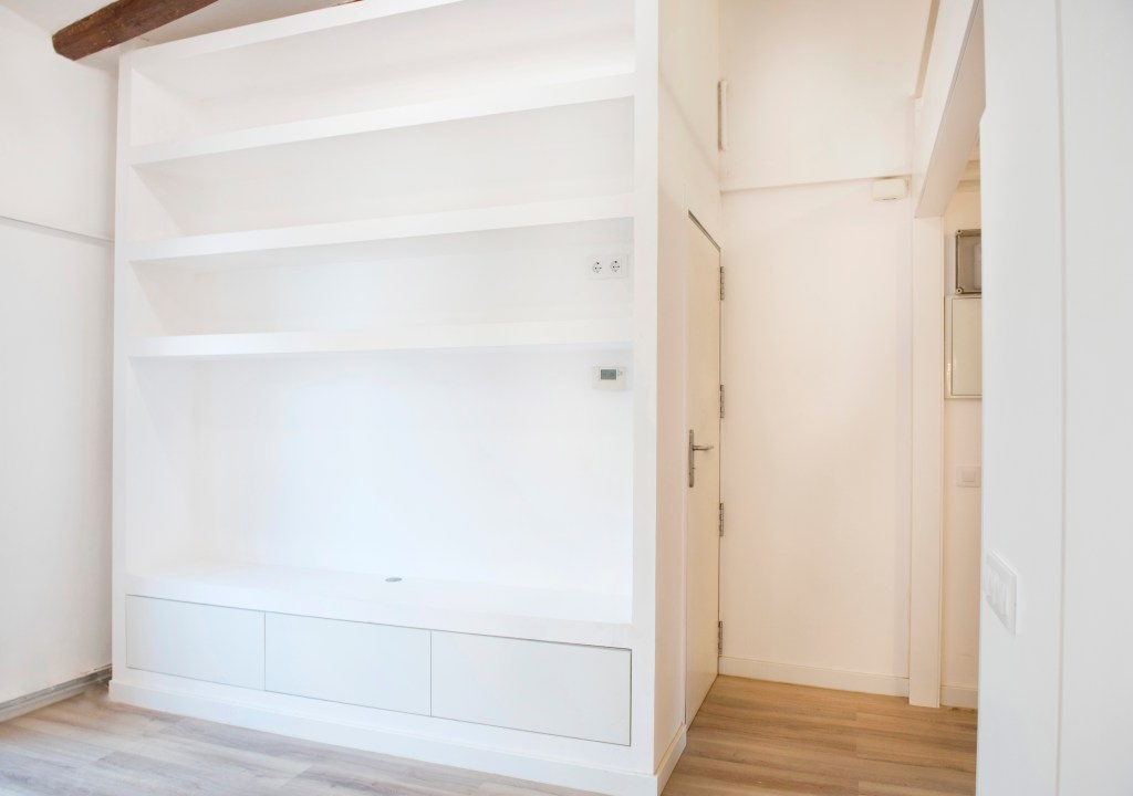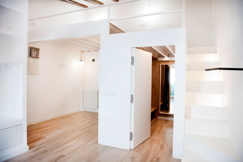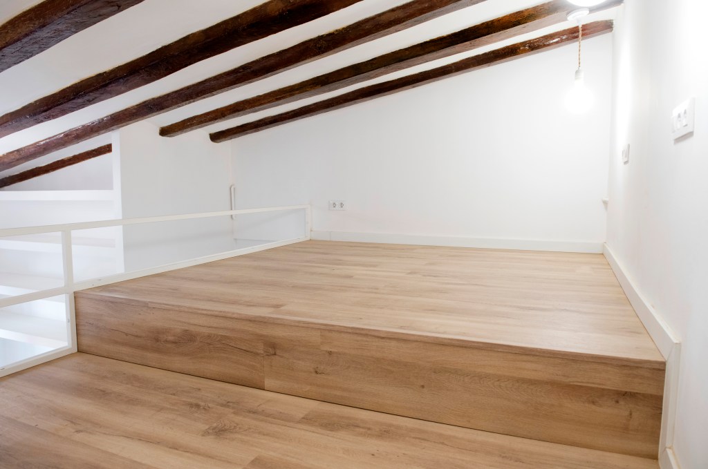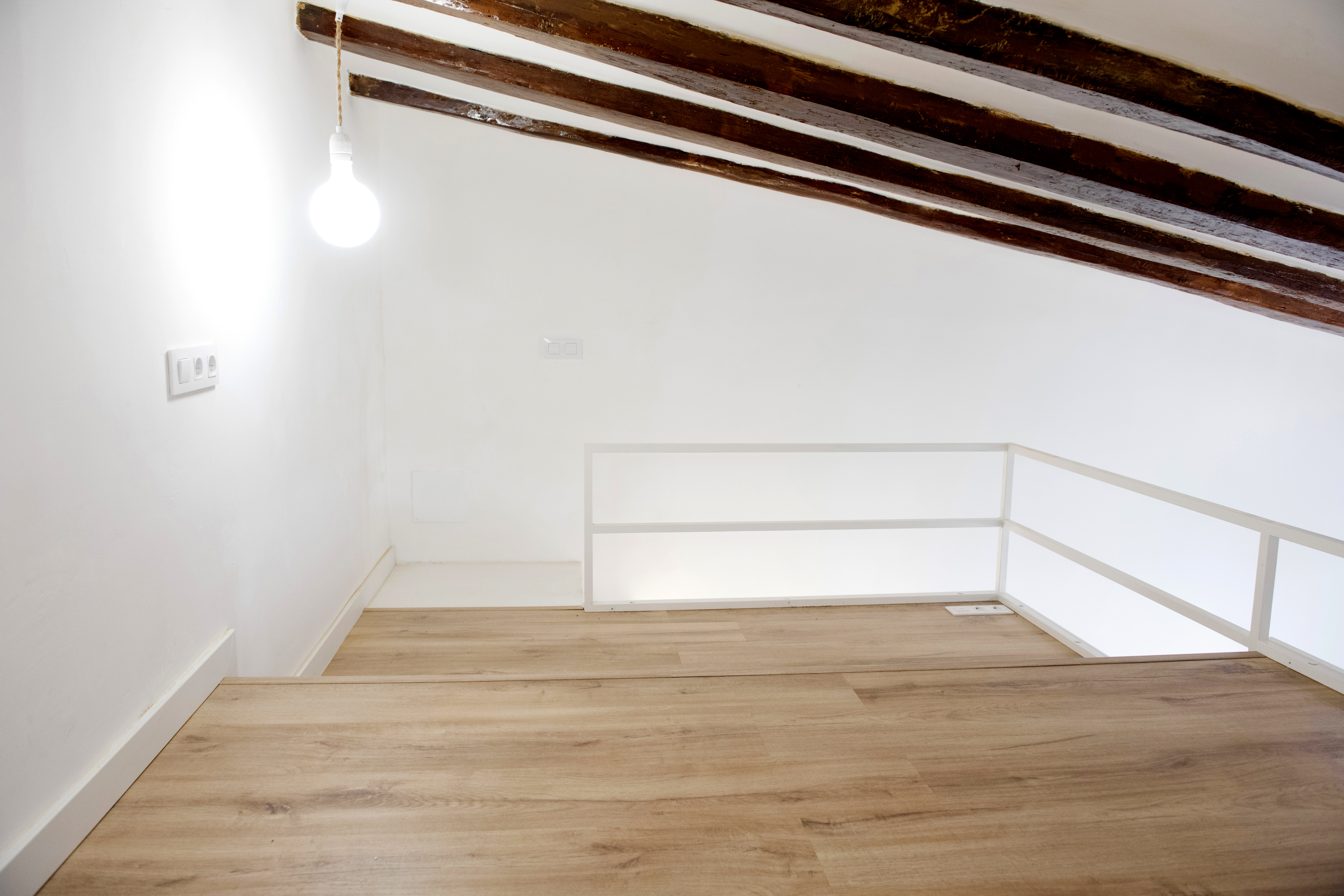 Aprofitant fins l’últim centímetre de l’espai que es creava a la part inferior, es dissenya un vestidor i la zona de menjador. La resta del espai es completa amb la sala d’estar amb una gran llibreria de pladur a mida. Tot el conjunt es dissenya amb colors clars per tal de potenciar l’espai i la llum natural.