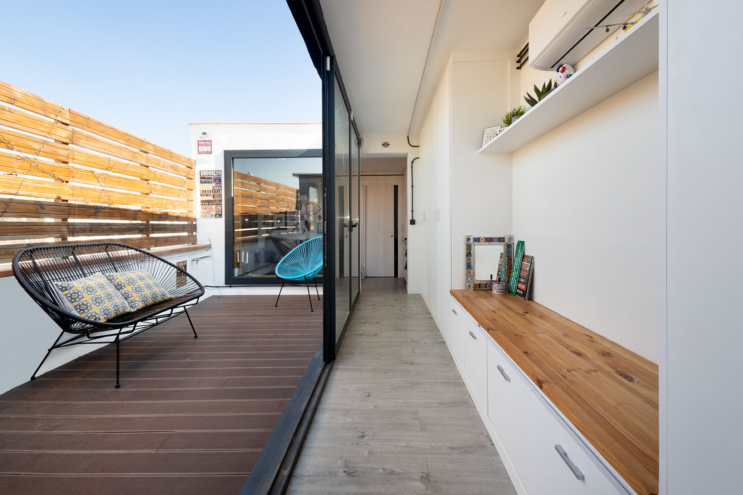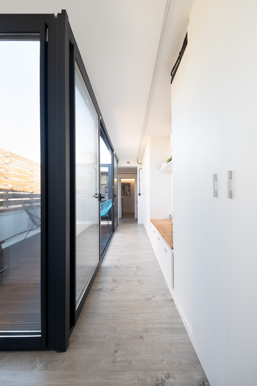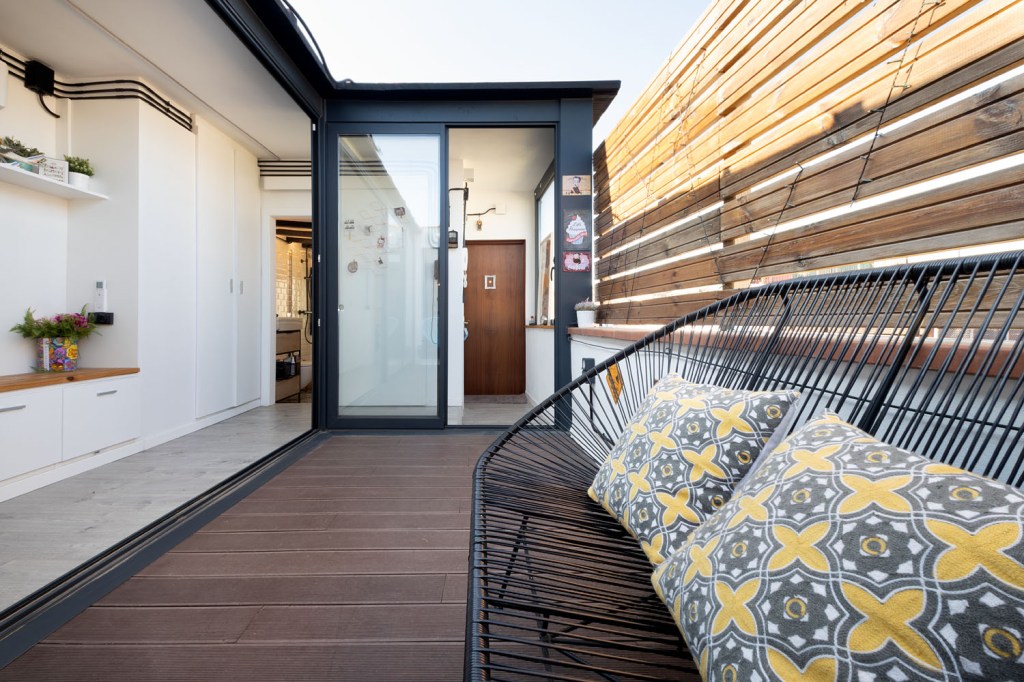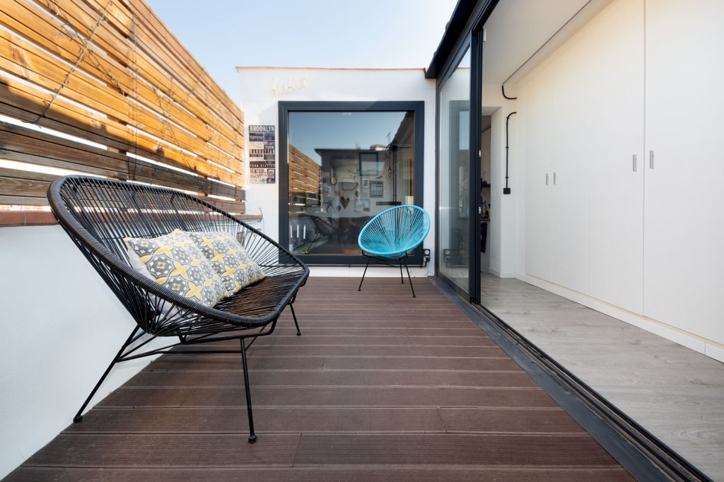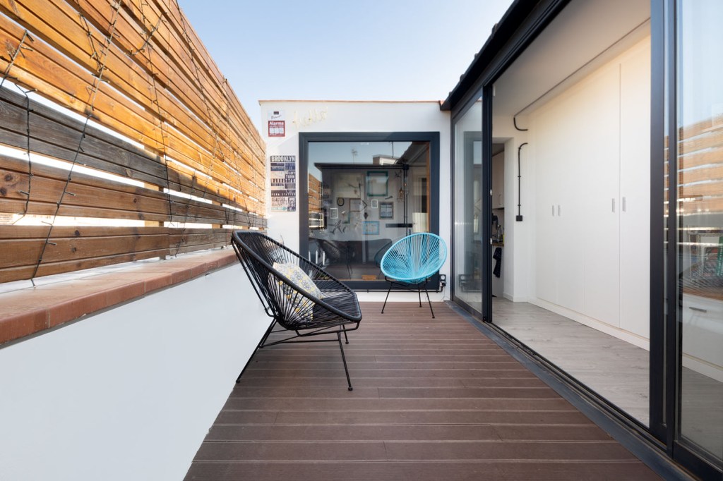 Este mini ático, en el centro de Barcelona, era la antigua casita del portero del edificio y supuso un gran reto de distribución dados los pocos m2 con los que contaba. La vivienda cuenta con un recibidor con armario integrado, un baño completo y un pasillo con mucho almacenamiento que rodean una terraza con vistas al mar. A continuación nos encontramos una sala de estar con cocina integrada y una pequeña barra para el desayuno. Por último, la habitación principal con un gran armario como segunda zona de almacenamiento. En total 40m2 donde cada centímetro cuenta y donde se ha potenciado la luz natural con grandes aberturas y vistas a la terraza como centro de la vivienda.