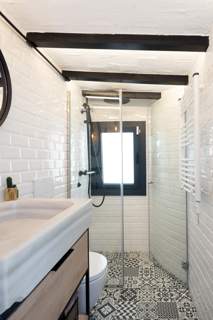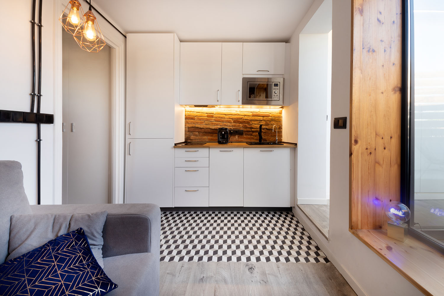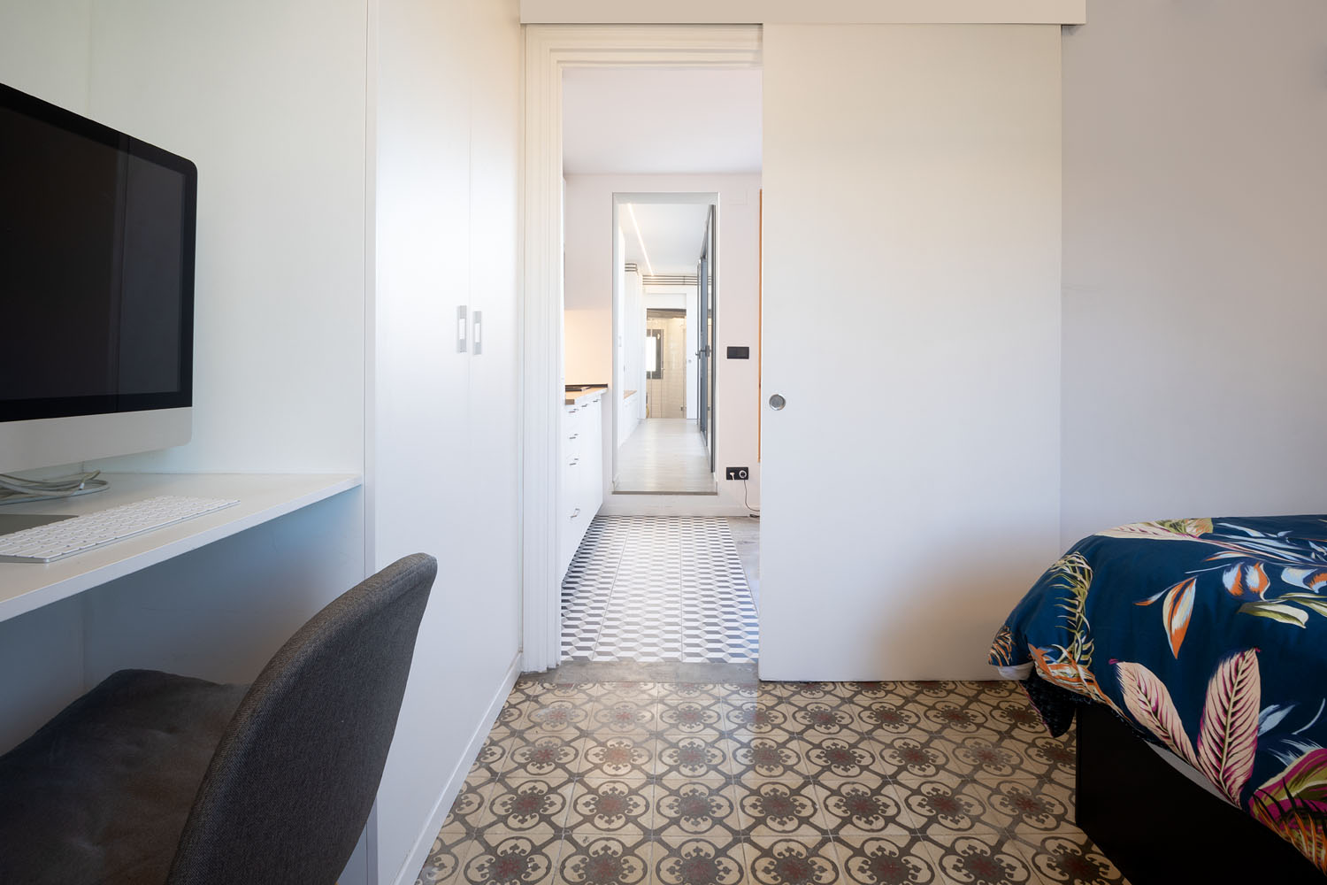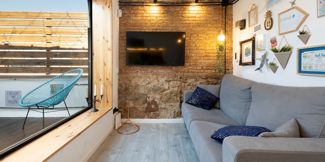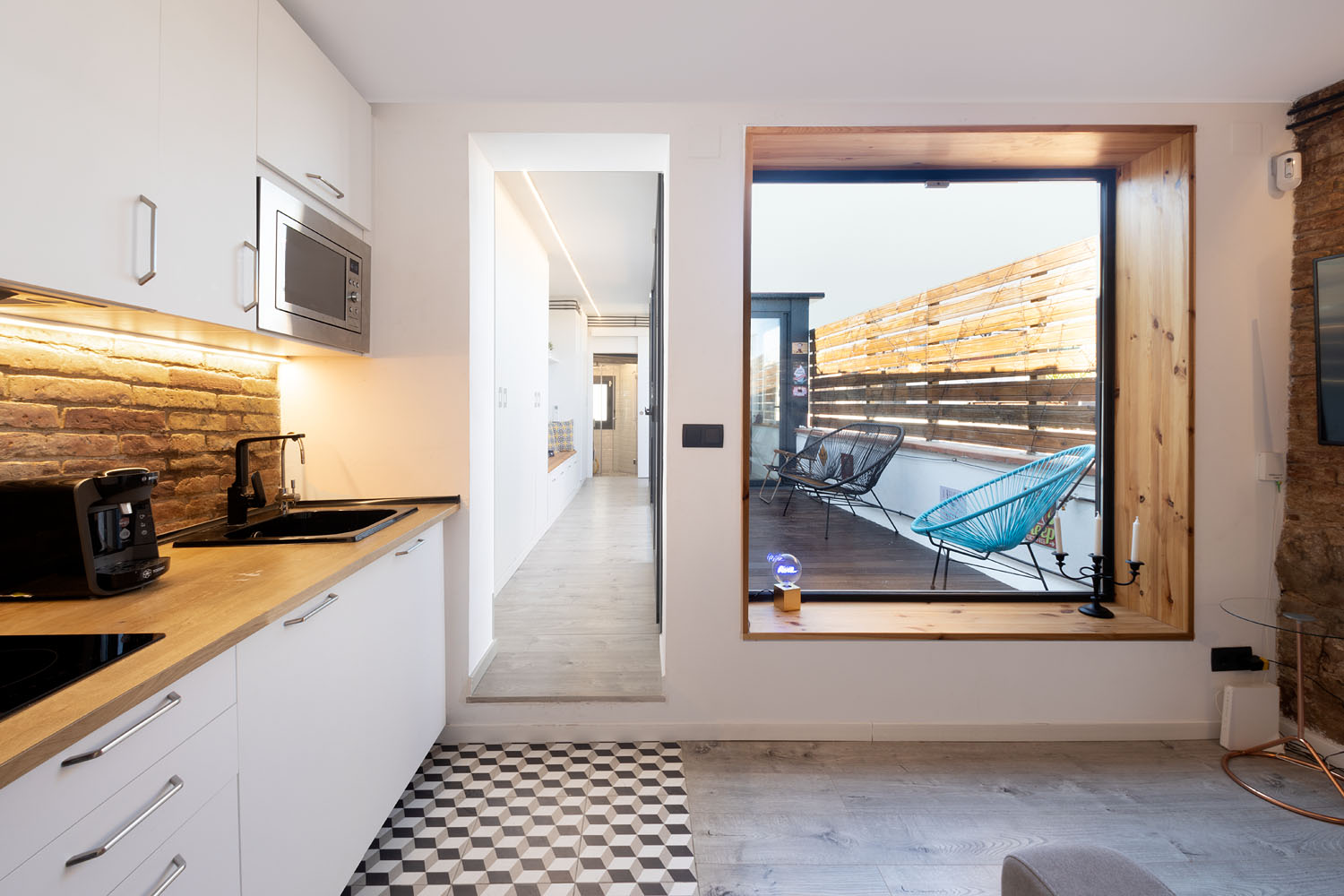 Este mini ático, en el centro de Barcelona, era la antigua casita del portero del edificio y supuso un gran reto de distribución dados los pocos m2 con los que contaba. La vivienda cuenta con un recibidor con armario integrado, un baño completo y un pasillo con mucho almacenamiento que rodean una terraza con vistas al mar. A continuación nos encontramos una sala de estar con cocina integrada y una pequeña barra para el desayuno. Por último, la habitación principal con un gran armario como segunda zona de almacenamiento. En total 40m2 donde cada centímetro cuenta y donde se ha potenciado la luz natural con grandes aberturas y vistas a la terraza como centro de la vivienda.