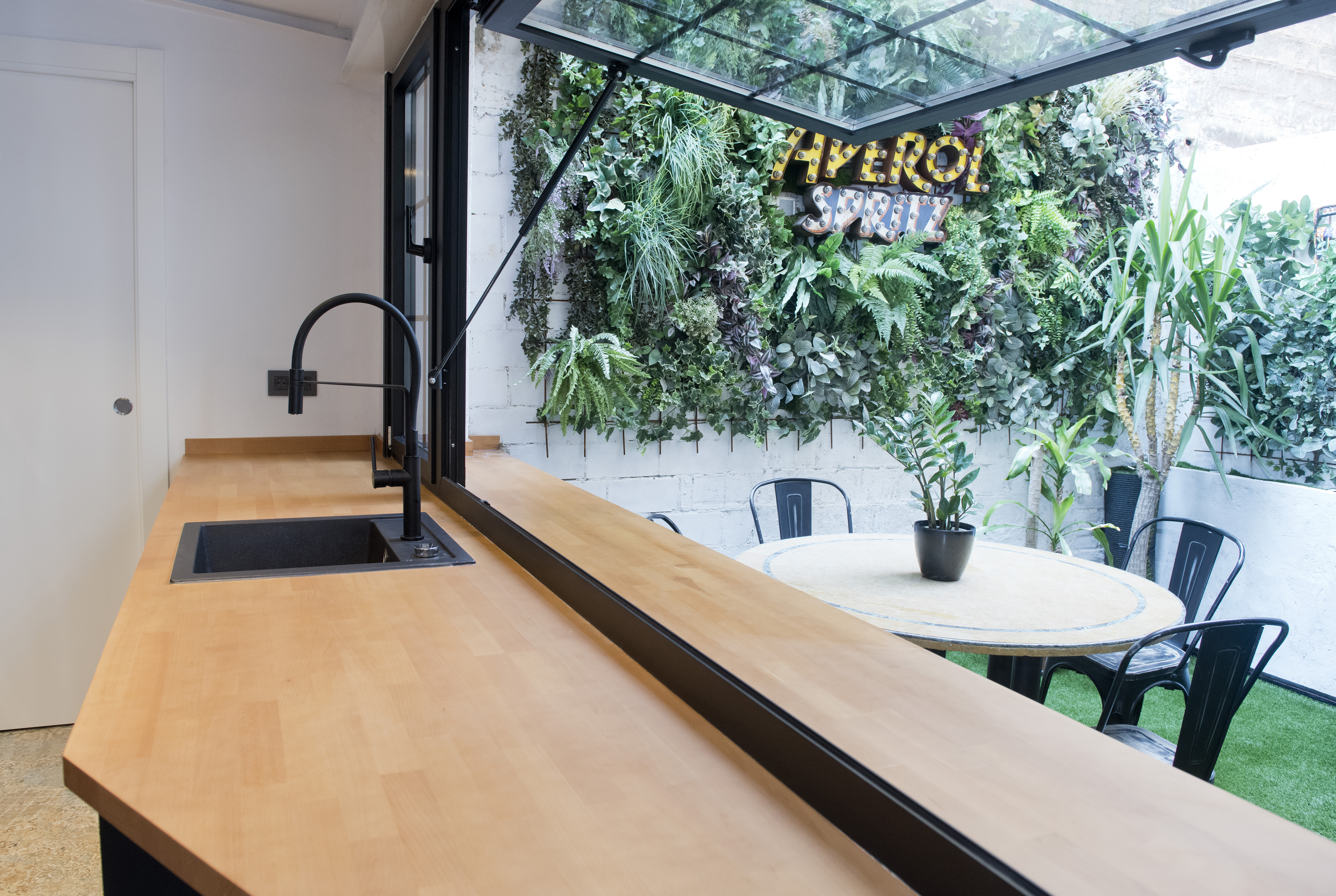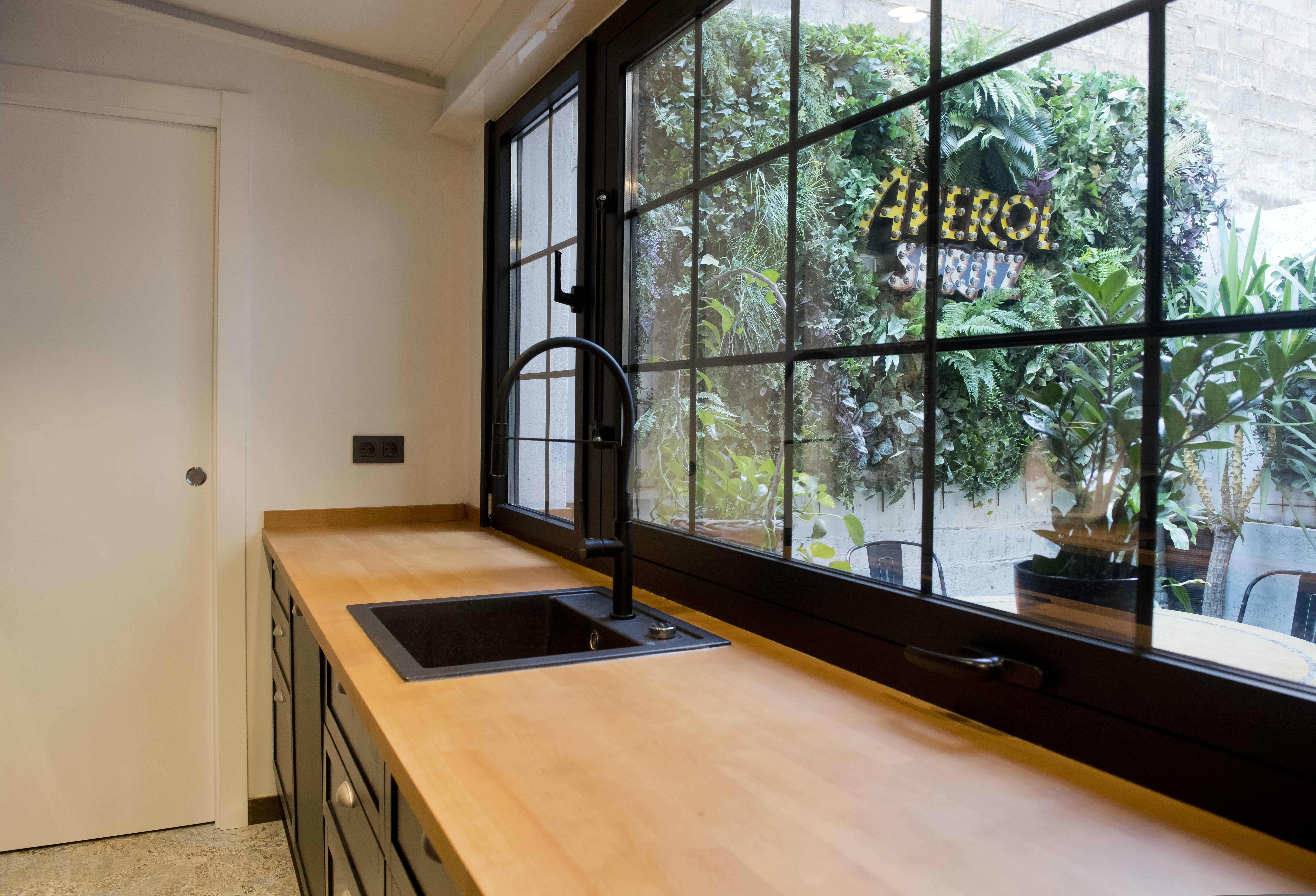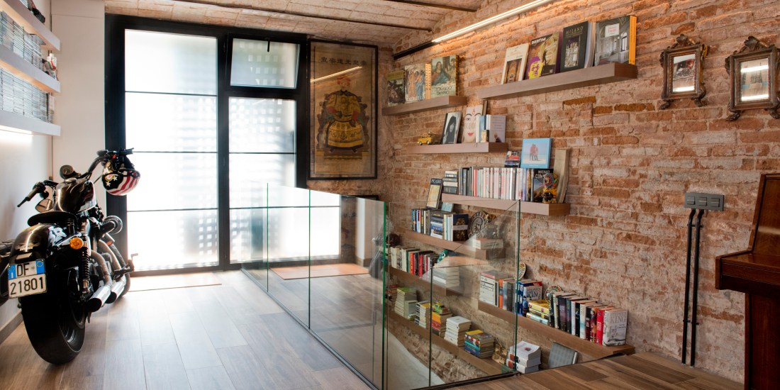 L’ambient interior s’articula a partir d’un estil eclèctic amb tocs industrials, posant en valor els elements originals de la construcció, com ara el maó vist i les bigues de fusta. Es projecta també una escala ampla d’accés al soterrani, que no només connecta amb fluïdesa amb la planta principal, sinó que millora substancialment la ventilació i l’aportació de llum d’aquest segon nivell.